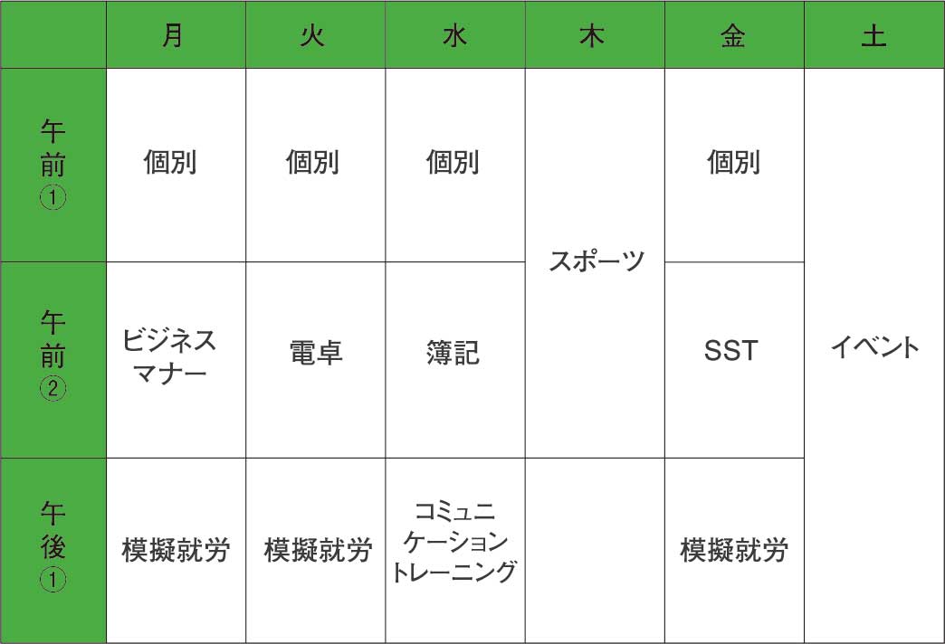 | 【必要とされる能力】 ◎基本的な生活リズム ◎家事全般 ◎一般常識・社会のルールの理解 ◎金銭感覚 ◎余暇の過ごし方 ◎移動能力 【プログラム】 イベント・フィールドワーク・遠足 ※必要に応じて、自立訓練で行っているプログラムを適宜行います |