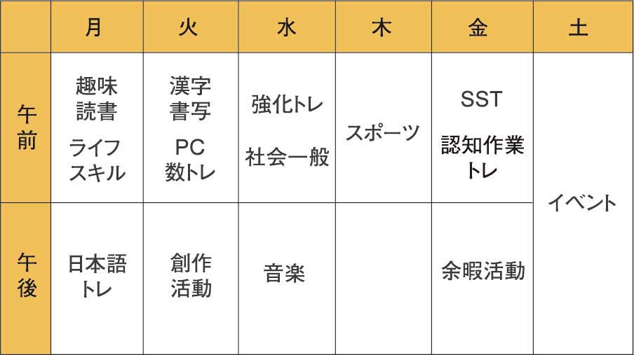 | 【認知機能強化トレーニング】「記憶、言語理解、注意、知覚、推論、判断」の認知機能の向上を目指す 【認知作業トレーニング】「身体を知る、力加減、動きの変化、物のコントロール、指先を使う、動きをまねる、動きを言葉で伝える」といった能力の向上を目指す 【実行機能】時間管理や忘れない工夫など問題解決をする能力の向上を目指す 【自主発表/フィールドワーク】各自、もしくはグループで発表することで、調べる力、まとめる力、発表する力の向上を目指す |
