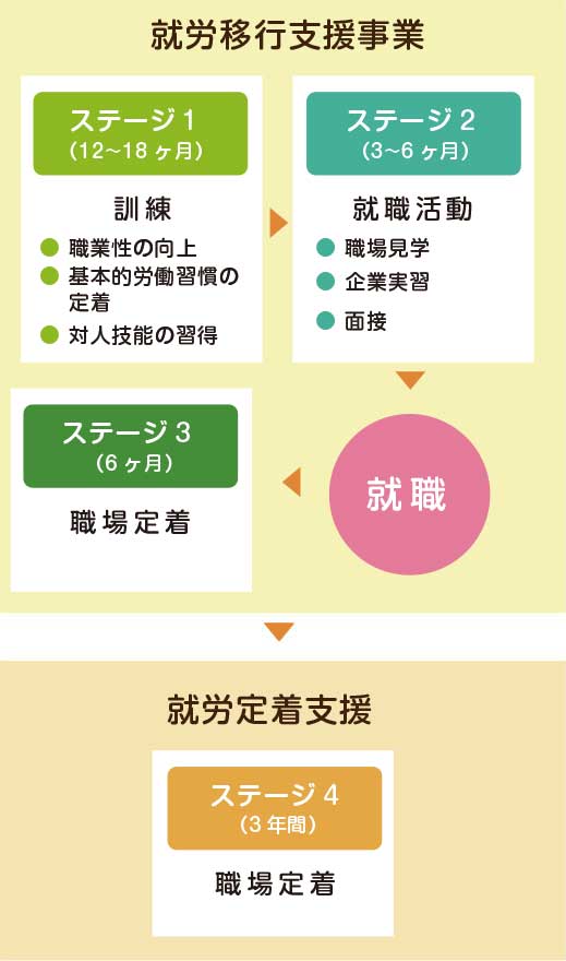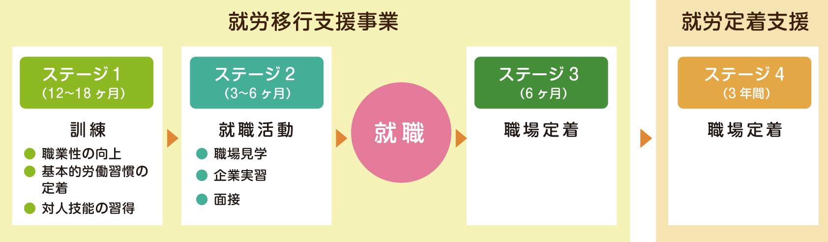 一般就労等への移行に向けて、事業所内や企業における作業や実習、 適性に合った職場探し、就労後の職場定着のための支援を行います。